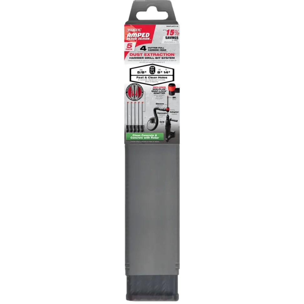 - Compact Snap-Lock Adapter (sold separately, two versions for SDS-Plus and SDS-Max) connects the AMPED Rebar Demon Dust Extraction Hammer drill bit to vacuums for maximum dust and debris extraction and allows you to easy and quickly exchange different drill bit sizes