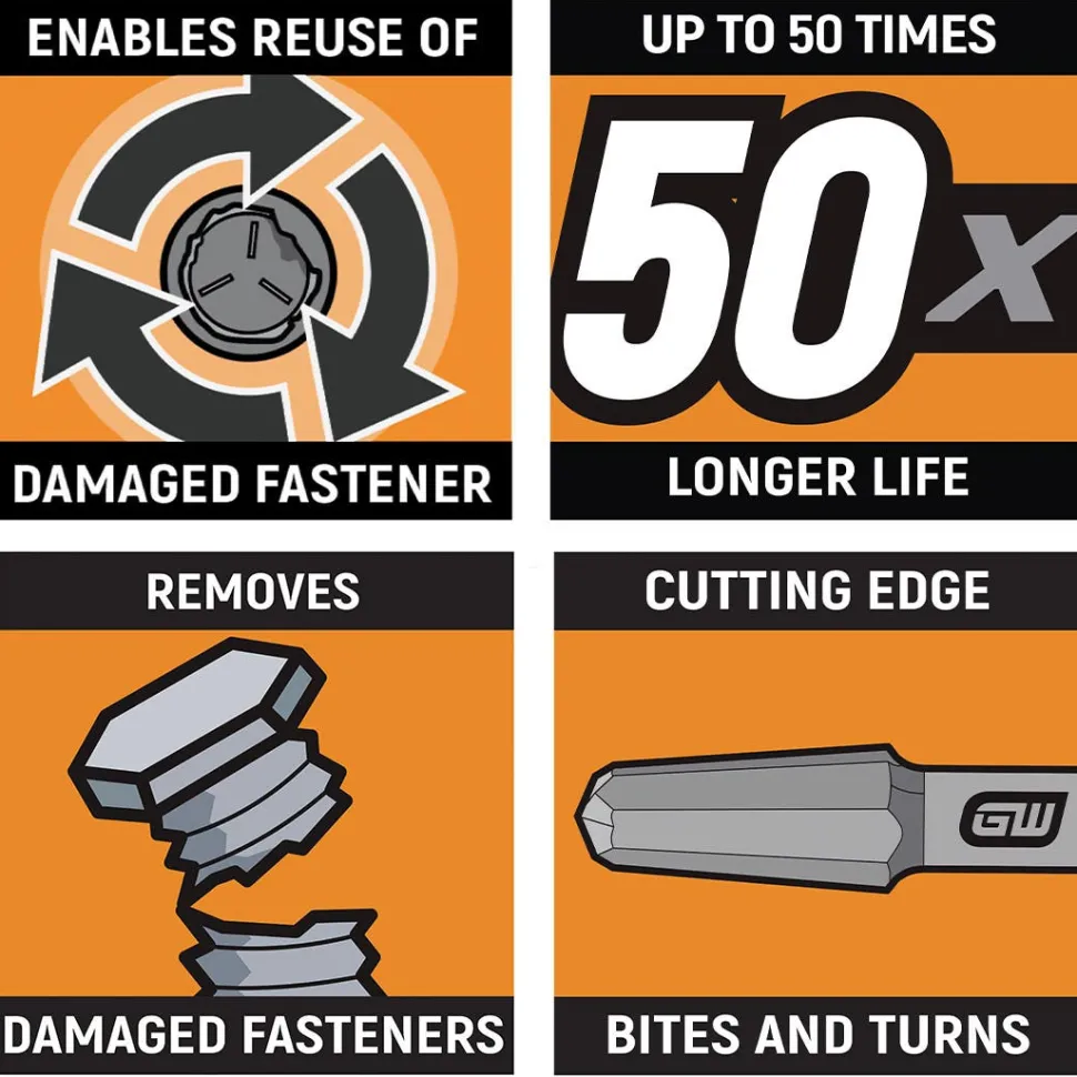 GEARWRENCH Bolt Biter Screw Extractors are designed with tapered side and tip cutting edges that work together to grip and turn the most stubborn fasteners. High strength steel construction delivers up to 50 times longer life compared to competitive extractors, and bi-directional capability allows you to reuse specialty fasteners in a pinch. They work with both hand and power tools, giving you total control over every extraction situation.