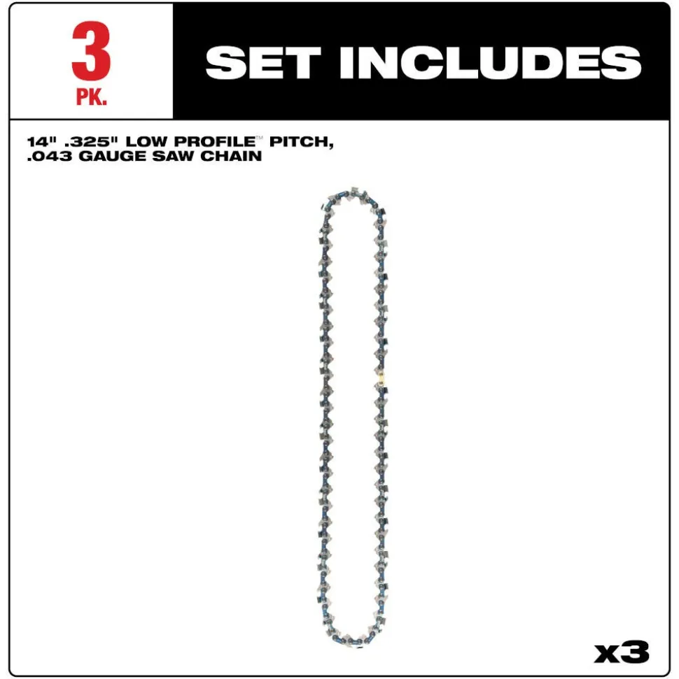 - Includes (3) 14″ .325″ LOW PROFILE™ Pitch, .043″ Gauge Saw Chains